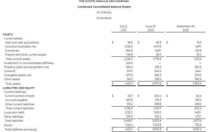 With approximately $4.1 billion in sales, the Company is one of the world’s largest marketers of branded consumer products for lawn and garden care. The Company’s brands are among the most recognized in the industry. The Company’s Scotts®, Miracle-Gro® and Ortho® brands are market-leading in their categories. The Company’s wholly owned subsidiary, The Hawthorne Gardening Company, is a leading provider of nutrients, lighting and other materials used in the indoor and hydroponic growing segment. For additional information, visit us at www.scottsmiraclegro.com.