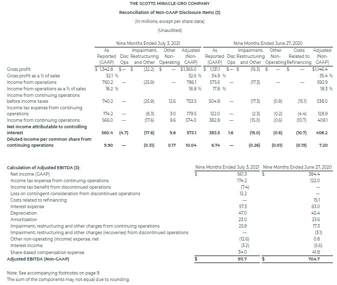 ScottsMiracle-Gro Announces Record Third Quarter Financial Results; Reaffirms Sales and Earnings Guidance for Fiscal 2021