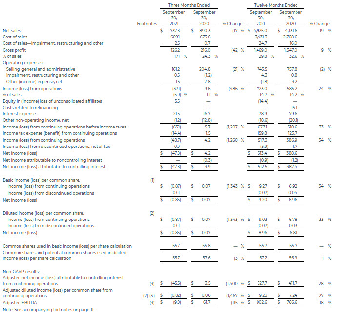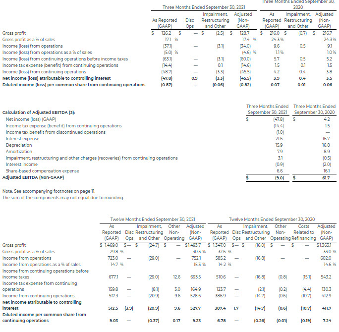 - The COVID-19 pandemic has had, and continues to have, an impact on financial markets, economic conditions, and portions of the Company’s business and industry. The Company has actively addressed the pandemic’s ongoing impact on its employees, operations, customers, consumers, and communities, by, among other things, implementing contingency plans, making operational adjustments where necessary, and providing assistance to organizations that support front-line workers. During the three and twelve months ended September 30, 2021, the Company incurred costs of $2.5 million and $25.0 million, respectively, in the “Cost of sales—impairment, restructuring and other” line in the Condensed Consolidated Statements of Operations and incurred costs of $0.6 million and $4.2 million, respectively, in the “Impairment, restructuring and other” line in the Condensed Consolidated Statements of Operations associated with the COVID-19 pandemic primarily related to premium pay. These direct and incremental costs were excluded from the Company’s non-GAAP financial measures because they are not comparable from one period to the next and are not expected to be part of the ongoing operations of the Company’s underlying business.