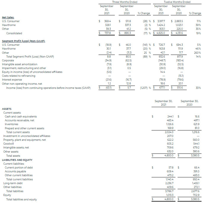 “Commodity prices were a headwind throughout fiscal ’21 but were partially offset in the quarter by price increases in our U.S. Consumer segment that took effect in August,” said Cory Miller, chief financial officer. “We have communicated to our retail partners that we will take additional pricing actions effective in January as we continue to battle higher costs from urea, resin, grass seed and other commodities.”