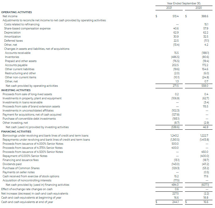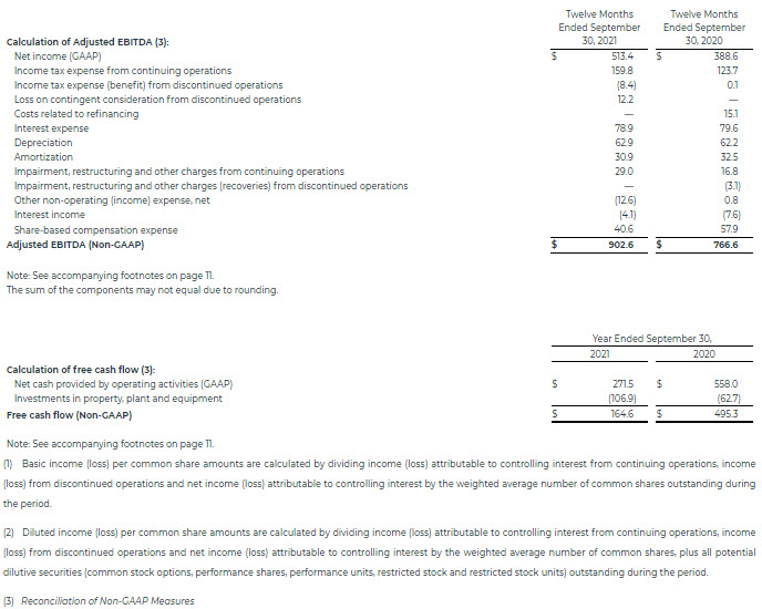 For the year ended September 30, 2021, company-wide sales increased 19 percent to a record $4.93 billion, compared with $4.13 billion a year earlier. GAAP earnings from continuing operations were $9.03 per diluted share, compared with $6.78 per diluted share in the prior year. Non-GAAP adjusted earnings, which are the basis of the Company’s guidance and exclude impairment, restructuring, and other non-recurring items, were $9.23 per diluted share compared with $7.24 per diluted share a year ago.