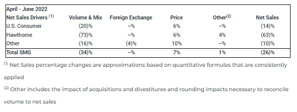 For the quarter ended July 2, 2022, company-wide sales decreased 26 percent to $1.19 billion. U.S. Consumer segment sales declined 14 percent to $904.5 million from $1.05 billion. Hawthorne segment sales decreased 63 percent to $154.5 million compared with $421.9 million during the same period last year.