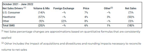 Company-wide sales for the first nine months of fiscal 2022 decreased 18 percent to $3.43 billion compared with $4.19 billion a year ago. Sales in the U.S. Consumer segment decreased 7 percent, to $2.63 billion. Hawthorne sales decreased 50 percent to $547.7 million.