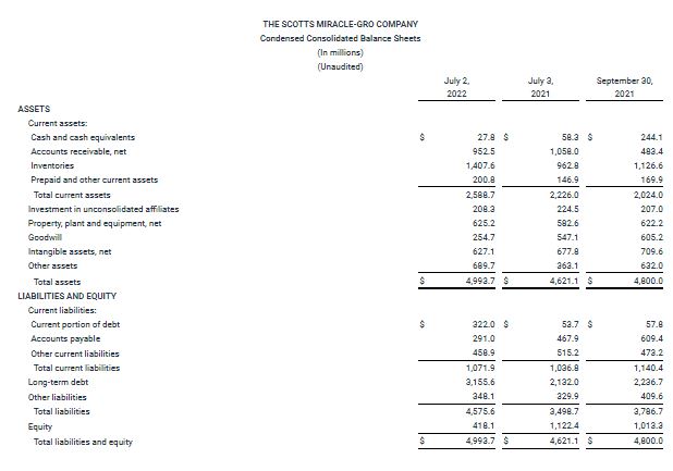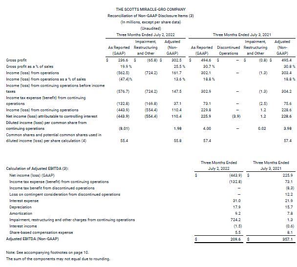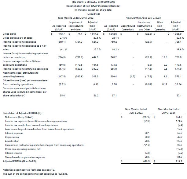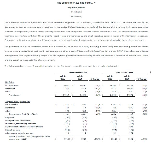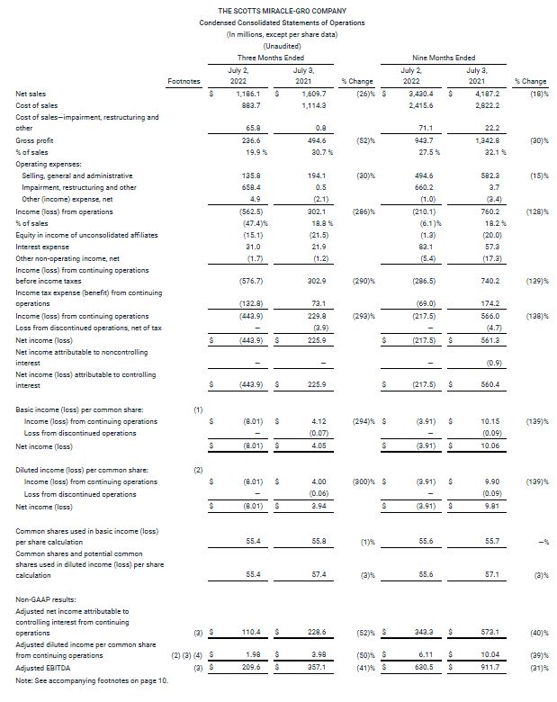 MARYSVILLE, Ohio, Aug. 03, 2022 (GLOBE NEWSWIRE) — The Scotts Miracle-Gro Company (NYSE: SMG), the world’s leading marketer of branded consumer lawn and garden as well as indoor and hydroponic growing products, today announced its results for the third quarter ended July 2, 2022.