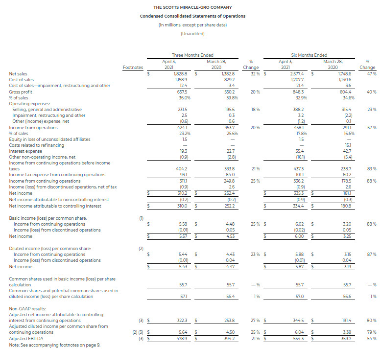 MARYSVILLE, Ohio, May 05, 2021 (GLOBE NEWSWIRE) — The Scotts Miracle-Gro Company (NYSE: SMG), the world’s leading marketer of branded consumer lawn and garden as well as indoor and hydroponic growing products, today announced company-wide sales increased 32 percent in its fiscal second quarter driven by strong volume growth in both major business segments.