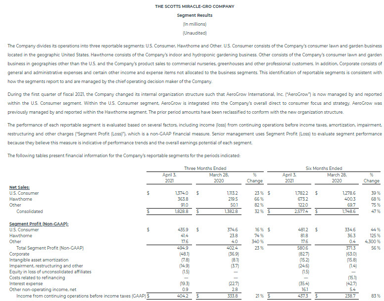 For the fiscal second quarter, the Company reported sales of $1.83 billion, up 32 percent from $1.38 billion a year earlier. U.S. Consumer segment sales increased 23 percent to $1.37 billion. Sales for the Hawthorne segment increased 66 percent to $363.8 million. Due to the Company’s fiscal calendar, the second quarter of 2021 ended six days later than the second quarter of fiscal 2020. The shift had a sales impact of approximately $122.5 million within the lawn and garden business, impacting the U.S. Consumer and Other segments.