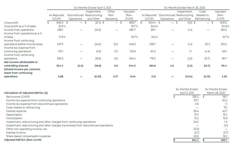 For the three and six months ended April 3, 2021, the following items were adjusted, in accordance with the definitions above, to arrive at the non-GAAP financial measures: