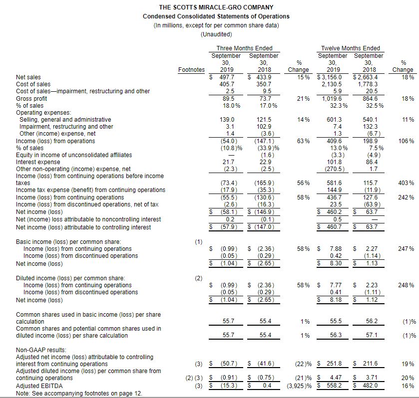 MARYSVILLE, Ohio, Nov. 06, 2019 (GLOBE NEWSWIRE) — The Scotts Miracle-Gro Company (NYSE: SMG), the world’s leading marketer of branded consumer lawn and garden as well as indoor and hydroponic growing products, today released record fiscal fourth quarter and full year financial results that were driven by the continued strength of both its U.S. Consumer and Hawthorne reporting segments.