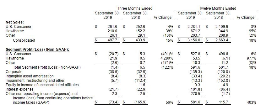 - In connection with the acquisition of Sunlight Supply during the third quarter of fiscal 2018, the Company announced the launch of an initiative called Project Catalyst, which is a company-wide restructuring effort to reduce operating costs throughout the U.S. Consumer, Hawthorne and Other segments and drive synergies from recent acquisitions within the Hawthorne segment. During the three and twelve months ended September 30, 2019, the Company continued to execute on its planned facility closures and consolidations which resulted in charges of $5.7 million and $13.7 million, respectively, related to Project Catalyst. During the three and twelve months ended September 30, 2019, the Company recognized charges of $2.5 million and $5.9 million, respectively, in the “Cost of sales—impairment, restructuring and other” line in the Condensed Consolidated Statements of Operations related to employee termination benefits, facility closure costs and impairment of property, plant and equipment. During the three and twelve months ended September 30, 2019, the Company recognized charges of $3.2 million and $7.8 million, respectively, in the “Impairment, restructuring and other” line in the Condensed Consolidated Statements of Operations related to employee termination benefits and facility closure costs. The Company also recognized a charge of zero and $2.5 million for the three and twelve months ended September 30, 2019, respectively, in the “Other non-operating (income) expense, net” line in the Condensed Consolidated Statements of Operations related to the write-off of accumulated foreign currency translation loss adjustments of a foreign subsidiary that was substantially liquidated.
