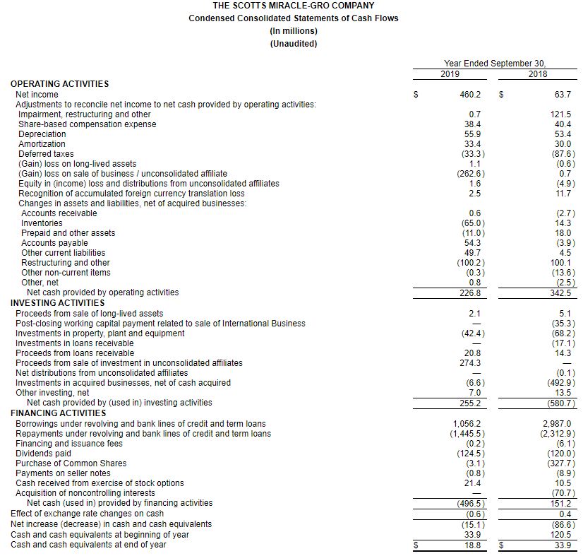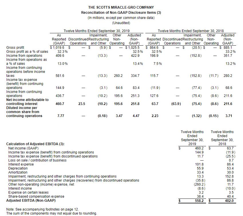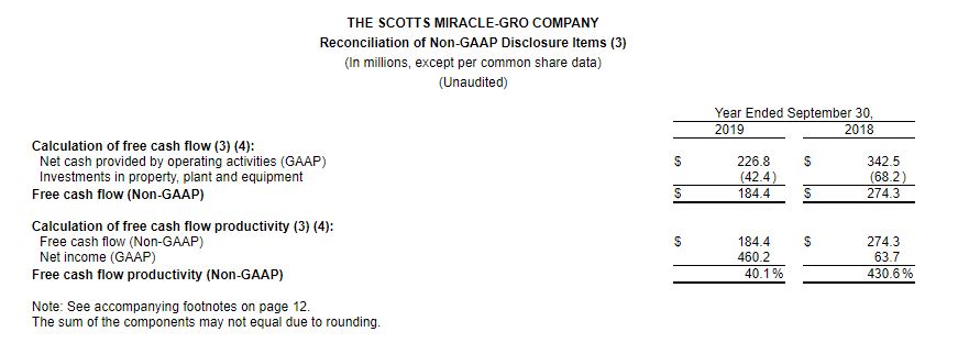 (4) For the twelve months ended September 30, 2019, net cash provided by operating activities and free cash flow include cash tax payments associated with the disposition of the TruGreen Joint Venture of approximately $100.0 million and payments made in connection with previously disclosed litigation settlements related to the legal matters In re Scotts EZ Seed Litigation and In re Morning Song Bird Food Litigation, net of insurance reimbursements and taxes, of approximately $45.0 million.