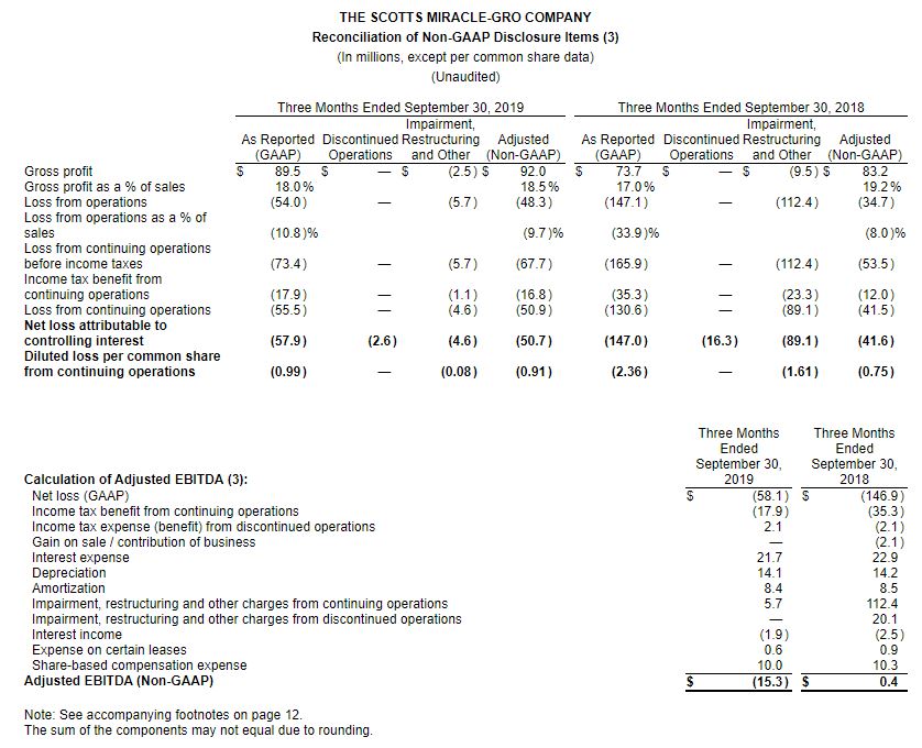 - During the three and twelve months ended September 30, 2019, the Company recognized favorable adjustments of zero and $0.4 million, respectively, related to the previously disclosed legal matter In re Scotts EZ Seed Litigation in the “Impairment, restructuring and other” line in the Condensed Consolidated Statements of Operations.