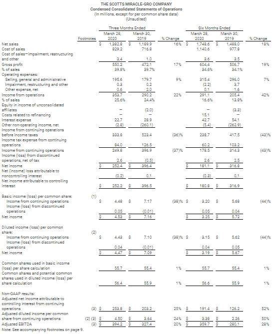 MARYSVILLE, Ohio, May 06, 2020 (GLOBE NEWSWIRE) — The Scotts Miracle-Gro Company (NYSE: SMG), the world’s leading marketer of branded consumer lawn and garden as well as indoor and hydroponic growing products, today announced company-wide sales increased 16 percent in its fiscal second quarter driven by strong volume growth in both major business segments.