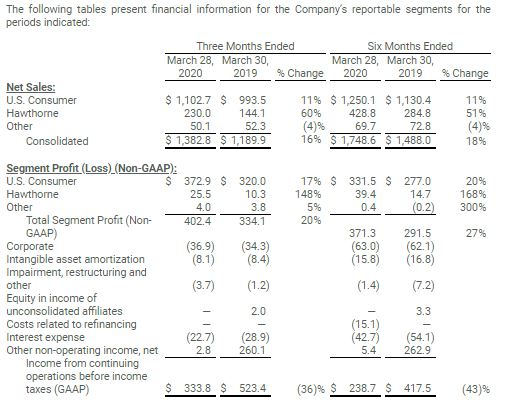 For the first six months of fiscal 2020, the Company reported sales of $1.75 billion, up 18 percent from $1.49 billion a year earlier. U.S. Consumer segment sales increased 11 percent to $1.25 billion. Sales for the Hawthorne segment increased 51 percent to $428.8 million.