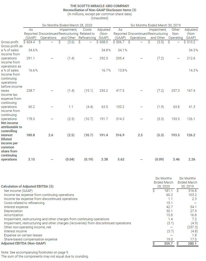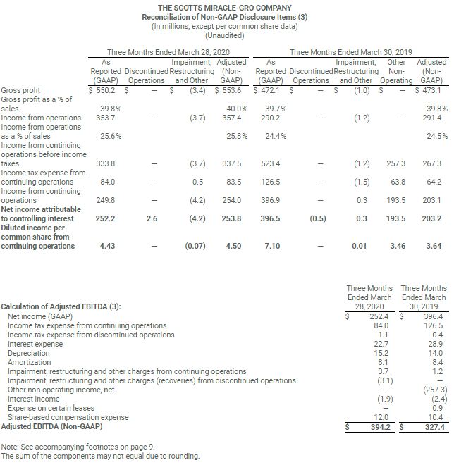 For the quarter ended March 28, 2020, GAAP earnings from continuing operations were $4.43 per share compared with $7.10 per share in the prior year. Prior year GAAP results were driven by the divestiture of the Company’s minority interest in TruGreen. Non-GAAP adjusted earnings – which are the basis of the Company’s financial guidance – were $4.50 per share compared with $3.64 a year ago.