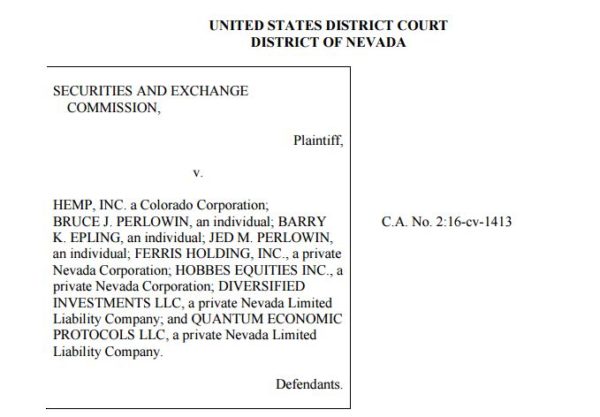 The SEC filed civil litigation against cannabis penny stock Hemp, Inc, (OTC: HEMP) and several affiliates, including CEO Bruce Perlowin, on June 20th, The complaint alleges that Perlowin and the company engaged in a long-running scheme involving “phony gifting” of shares and “bogus consulting” agreements that allowed insiders to sell hundreds of millions of shares that were not properly registered and that should have been restricted. Further, the SEC alleges that Perlowin and the other defendants, which included his brother Jeb and Barry Epling, made false statements to broker-dealers, Alpine Securities and Scottsdale Capital.