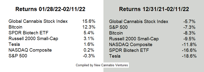 Two weeks ago, we lamented the horrible start to 2022 for cannabis stocks, pointing to the 18.4% decline in the New Cannabis Ventures Global Cannabis Stock Index during the first four weeks of the year. Since then, the index has rallied 15.6%, leaving it down 5.7% year-to-date. The improvement, which has been supported by higher trading volumes, has far outpaced the broader stock market or other high-risk sectors that we discussed then, and the rally has resulted in cannabis stocks now being the best performers year-to-date:
