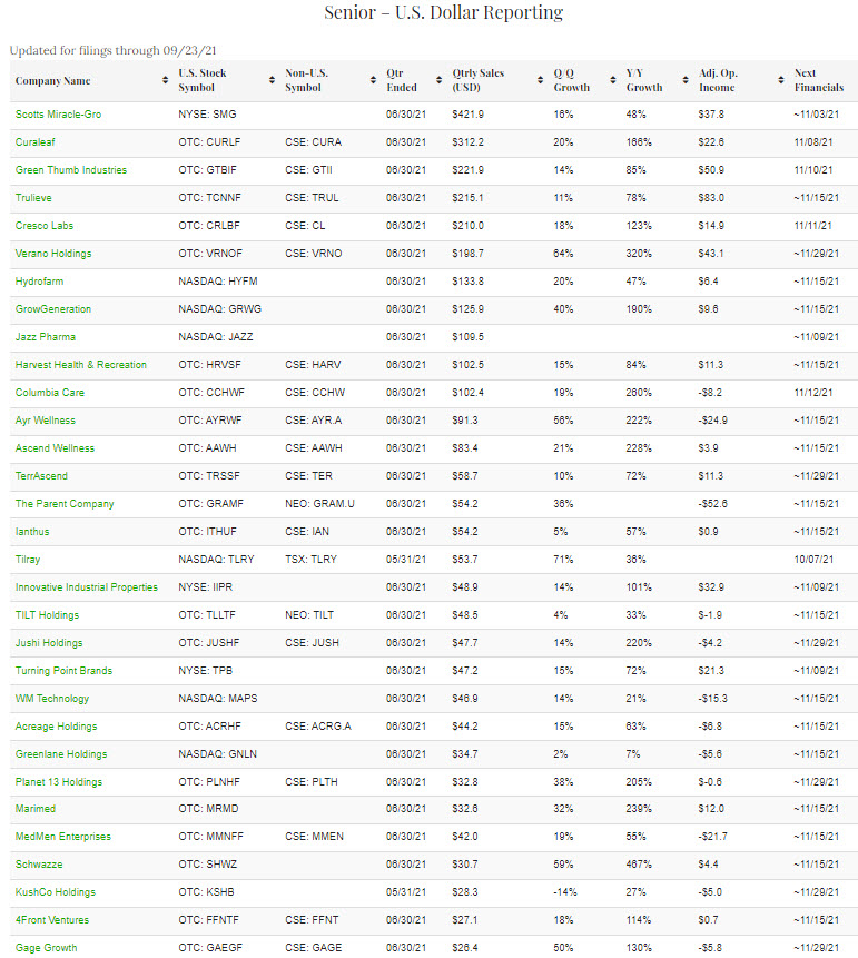 Due to the rapid growth in the cannabis industry, we raised the minimum to US$25 million (C$31 million) to qualify for what we are now calling the senior list and introducing a junior list with a minimum of US$12.5 million (C$15.5 million) in September. At the time of our last update in early September, 35 companies qualified for inclusion, including 31 filing in U.S. dollars and 4 in the Canadian currency, and this remains the number of qualifying companies. The junior list continues to include 12 reporting in U.S. dollars and 6 in Canadian dollars. On a combined basis, the Public Cannabis Company Revenue & Income Tracker includes 53 companies. We expect to add additional companies in the months ahead, and, due to pending or recently completed mergers, we anticipate some removals as well.