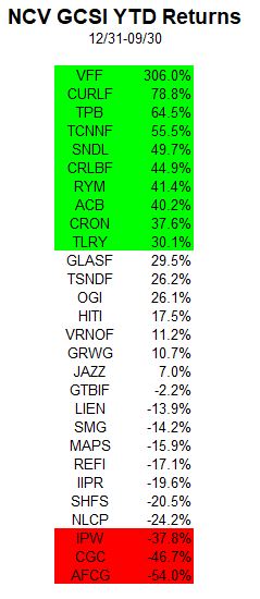 Cannabis stocks exploded higher on Monday. Despite the sharp advance that day, they ended September down slightly after soaring in August and July. Year-to-date, though, the Global Cannabis Stock Index is up 11.6%. After 4 straight annual declines, it is nice to see the index higher with just one quarter to go.