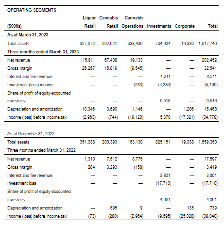 - Net revenue for the first quarter of 2023 of $202.5 million, compared to $240.4 million in the fourth quarter of 2022, and $17.6 million in the first quarter of 2022, representing a 1,050% increase year-over-year. The increase over the comparative quarter in the prior year is due to the acquisitions of Alcanna, Valens and Zenabis. The decrease in revenue in the first quarter of 2023, as compared to the fourth quarter of 2022, can be attributed to seasonality in the Liquor Retail segment, as the fourth quarter is traditionally the strongest and the first quarter is typically the weakest. This was partially offset by an increase in revenue from the Cannabis Operations segment due to the partial quarter contribution of Valens in 2023.