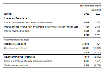 - For the first quarter of 2023, the investment portfolio generated interest and fee revenue of $4.2 million, share of profit of equity-accounted investees generated from investments by SunStream of $9.5 million, and an investment loss of $5.2 million, on marketable securities, which includes unrealized losses on its publicly disclosed strategic investment in Village Farms International, Inc.
