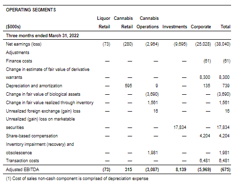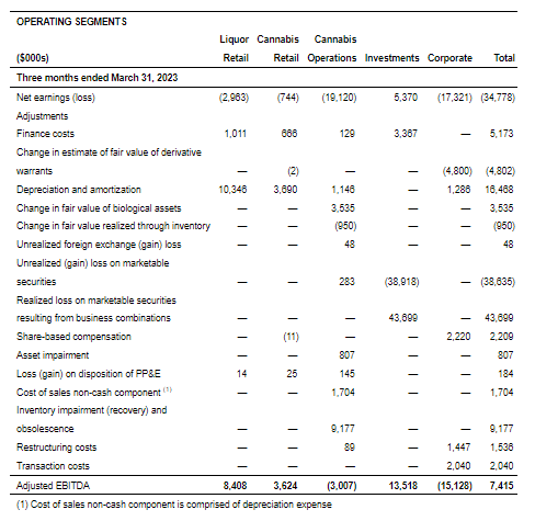 Adjusted EBITDA is a non-IFRS measure which the Company uses to evaluate its operating performance. Adjusted EBITDA provides information to investors, analysts, and others to aid in understanding and evaluating the Company’s operating results in a manner similar to its management team. Adjusted EBITDA is defined as net income (loss) from continuing operations before finance costs, depreciation and amortization, accretion expense, income tax recovery and excluding changes in fair value of biological assets, changes in fair value realized through inventory, unrealized foreign exchange gains or losses, unrealized gains or losses on marketable securities, realized gains or losses on investments resulting from business combinations, changes in fair value of derivative warrants, share-based compensation expense, asset impairment, gain or loss on disposal of property, plant and equipment and certain one-time non-operating expenses, as determined by management. The Company presents both consolidated, total Adjusted EBITDA and Adjusted EBITDA by operating segment.