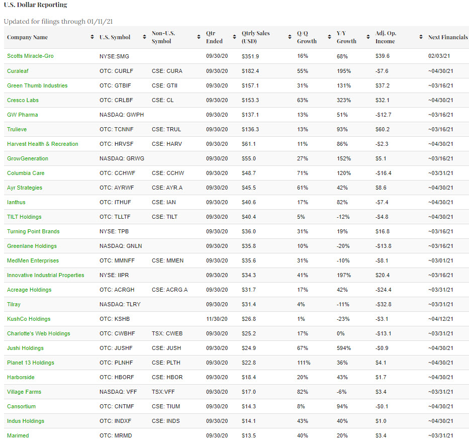 The Public Cannabis Company Revenue & Income Tracker, managed by New Cannabis Ventures, ranks the top revenue producing cannabis stocks that generate industry sales of more than US$12.5 million per quarter (C$16.1 million). This data-driven, fact-based tracker will continually update based on new financial filings so that readers can stay up to date. Companies must file with the SEC or SEDAR and be current to be considered for inclusion. Please note that we have raised the minimum quarterly revenue several times as the industry has scaled up, including from US$10.0 million in November 2020, US$7.5 million in June 2020, US$5.0 million in October 2019 and US$2.5 million in May 2019.