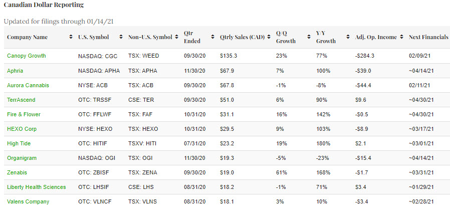 Canadian Dollar Reporting – Public Cannabis Company Revenue Tracker