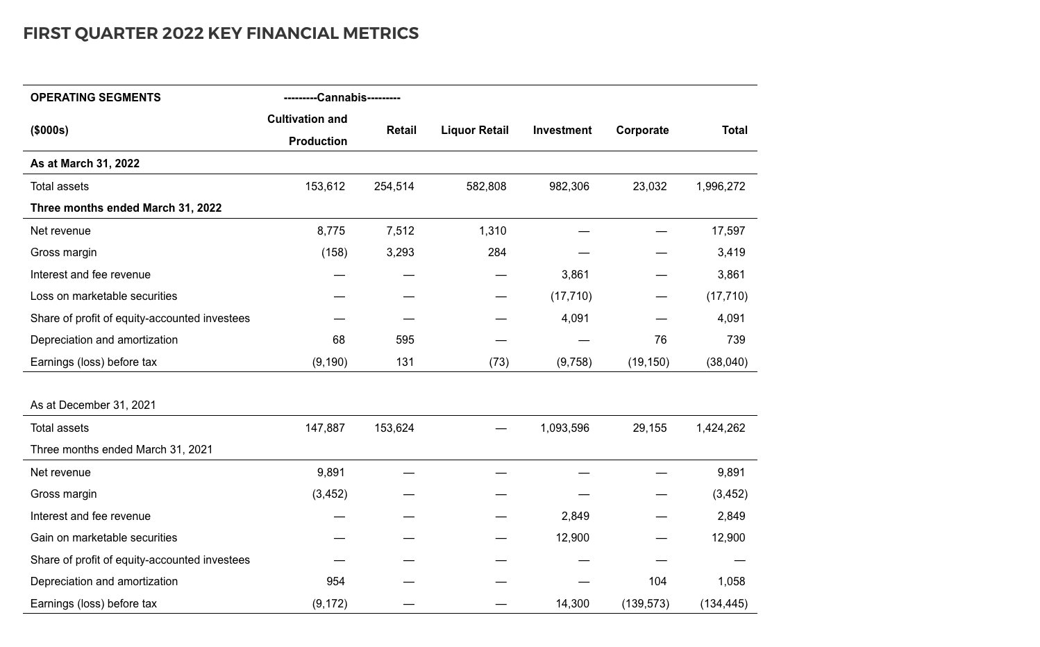 - Cannabis Retail: Net revenue of $7.5 million for the first quarter of 2022 (including $0.7 million for one day of revenue from Nova Cannabis Inc. (“Nova“) acquired as part of the Alcanna acquisition).