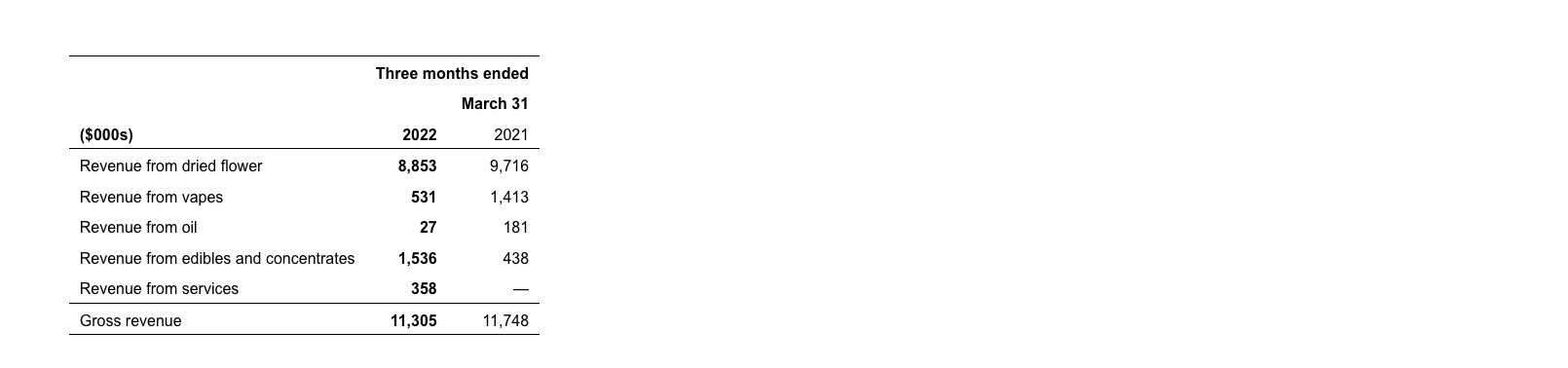 Gross revenue from branded cannabis products was $9.7 million for the first quarter of 2022, an increase of 8% compared to the first quarter of 2021. The increase in branded sales as part of the company’s product mix reflects the progress and commitment to executing its retail vertical integration strategy across Western Canada and Ontario. Total gross revenue from the cultivation and product of cannabis was $11.3 million for the first quarter of 2022, a decrease of 3% compared to the first quarter of 2021. The decline in gross revenue was driven by a 42% decrease in wholesale sales to other Licensed Producers in the first quarter of 2022 versus the first quarter of 2021.