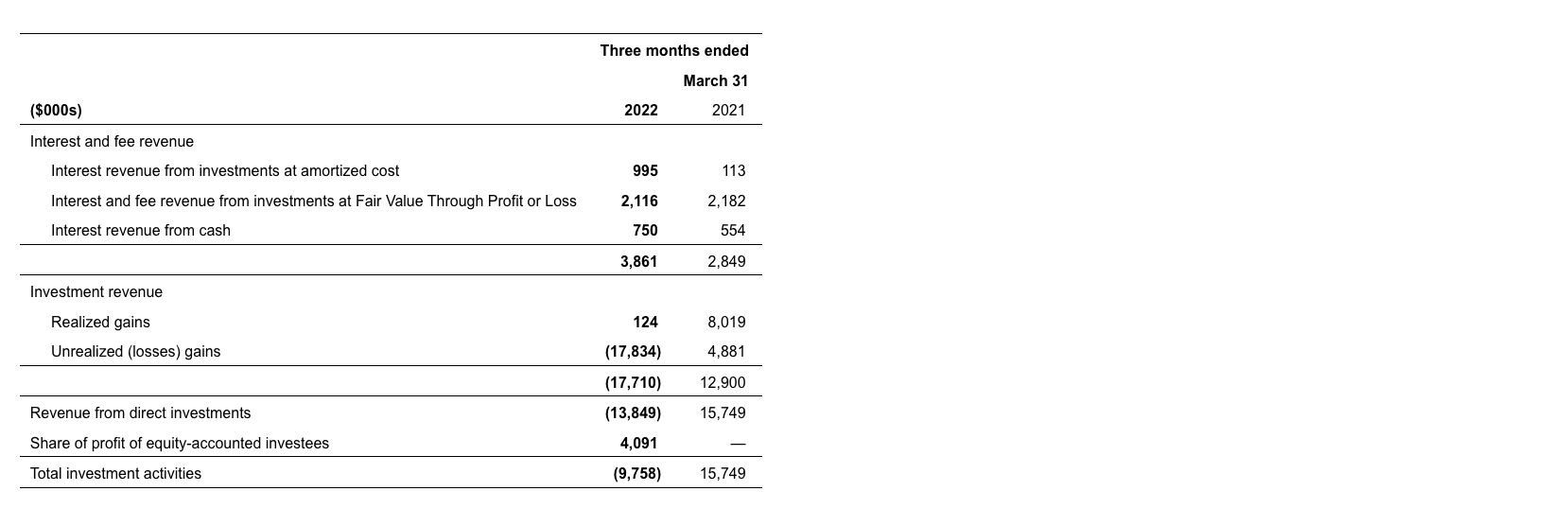 Revenue from investments in the first quarter of 2022 was negative $17.7 million, including unrealized losses on marketable securities of $17.8 million, due to fluctuations in share prices from our strategic equity portfolio of Canadian cannabis-related investments.