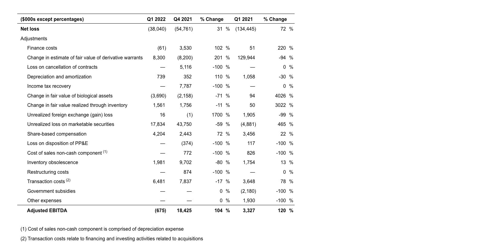 Adjusted EBITDA is a non-IFRS measure which the Company uses to evaluate its operating performance. Adjusted EBITDA provides information to investors, analysts, and others to aid in understanding and evaluating the Company’s operating results in a similar manner to its management team. Adjusted EBITDA is defined as net income (loss) from continuing operations before finance costs, depreciation and amortization, accretion expense, income tax recovery and excluding change in fair value of biological assets, change in fair value realized through inventory, unrealized foreign exchange gains or losses, unrealized gains or losses on marketable securities, change in fair value of derivative warrants, share-based compensation expense, asset impairment, gain or loss on disposal of property, plant and equipment and certain one-time non-operating expenses, as determined by management.