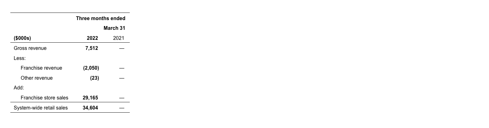 System-wide retail sales1 at were $34.6 million for the first quarter of 2022 compared to $41.4 million in the fourth quarter of 2021. System-wide retail sales represent the aggregate revenue earned by franchised Spiritleaf retail cannabis stores and corporate-owned Spiritleaf retail cannabis stores and do not represent revenues that accrue to the Company. The Company receives all revenues from corporate-owned Spiritleaf retail cannabis stores, and royalties and advertising fees in respect of the franchised Spiritleaf retail cannabis store revenue.
