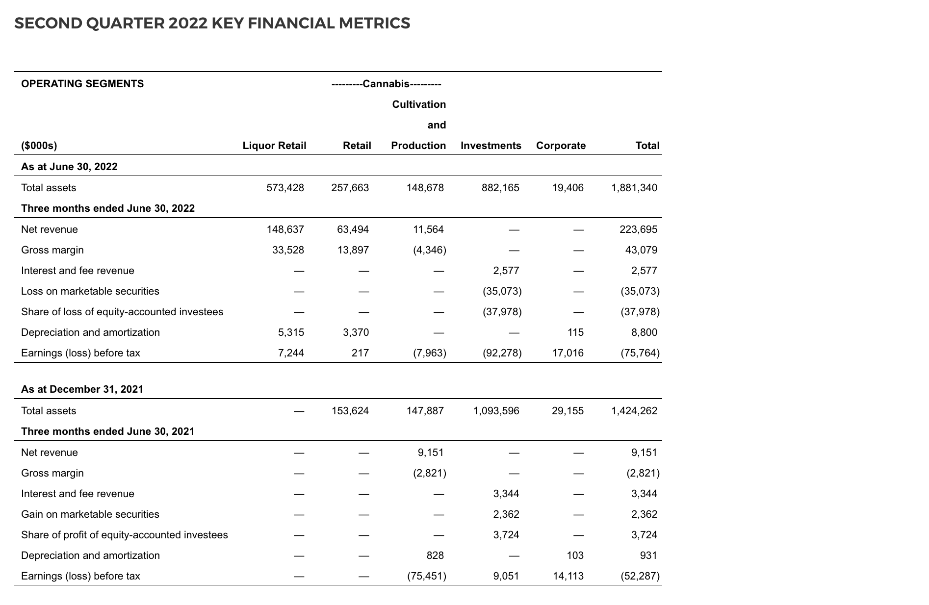 - As of the end of the second quarter of 2022, the Company had deployed capital on several cannabis-related investments totaling $689 million, including $490 million to the SunStream Bancorp Inc. joint venture (“SunStream”). For the second quarter of 2022, the investment portfolio generated interest and fee revenue of $2.6 million ($3.3 million in the second quarter of 2021), share of the profit of equity-accounted investees generated from investments by SunStream of negative $38.0 million ($3.7 million in the second quarter of 2021), and an investment loss of $35.1 million (gain of $2.4 million in the second quarter of 2021) on marketable securities, which includes unrealized losses on publicly disclosed strategic investments in Village Farms International, Inc. and The Valens Company Inc.