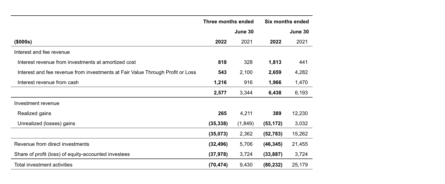 - Revenue from the Investments segment for the second quarter of 2022 was a loss of $35.1 million, compared to $2.4 million in the second quarter of 2021. The decrease was primarily due to accounting fair value adjustments reflecting an increase in the assumed risk-free rate and the deterioration in overall cannabis credit market conditions.