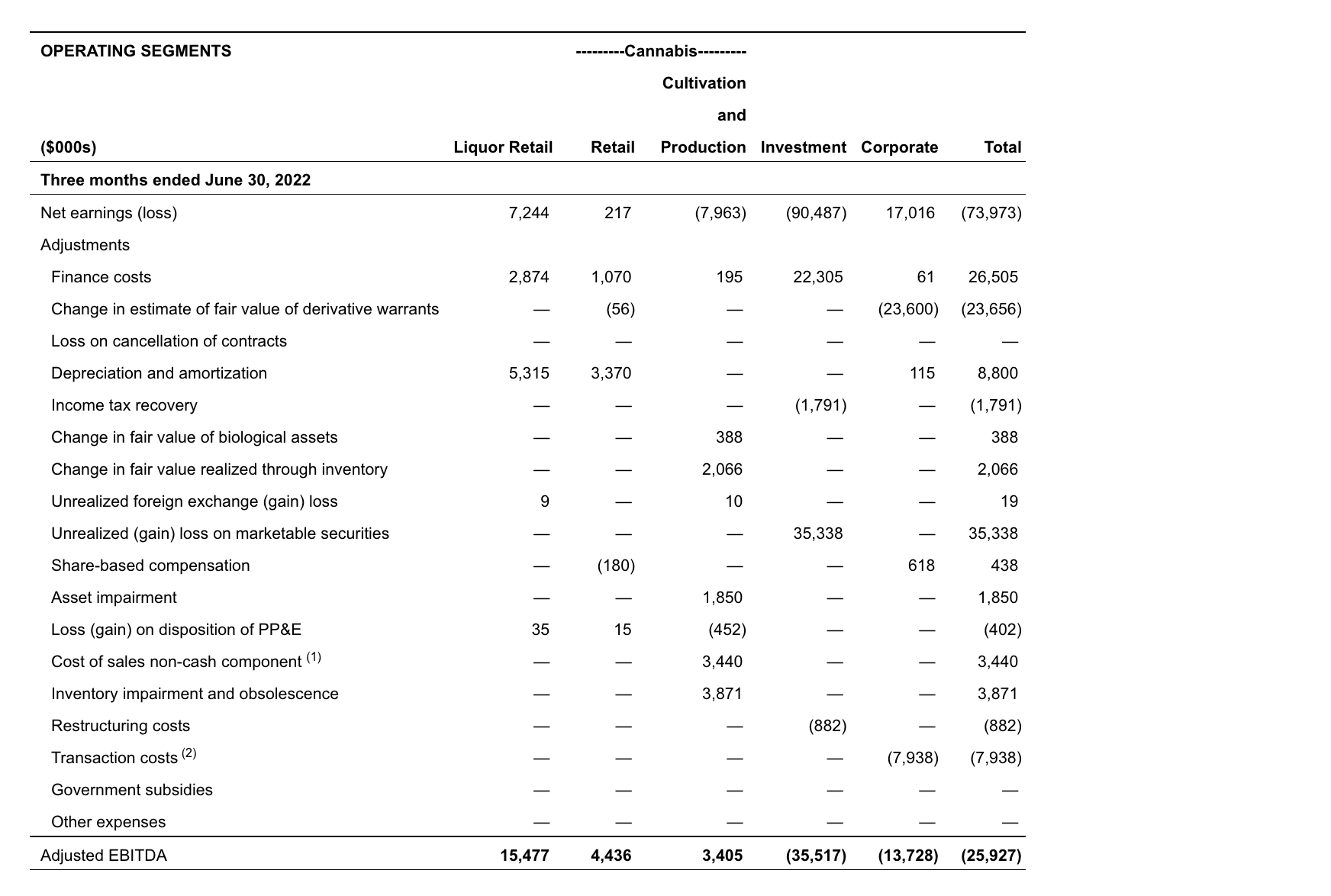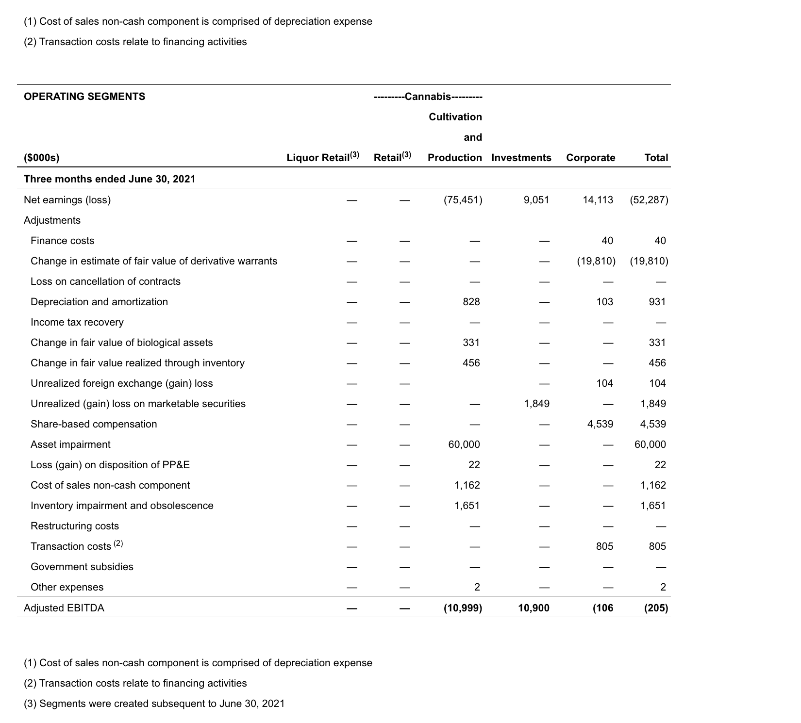 Adjusted EBITDA is a non-IFRS measure which the Company uses to evaluate its operating performance. Adjusted EBITDA provides information to investors, analysts, and others to aid in understanding and evaluating the Company’s operating results in a manner similar to its management team. Adjusted EBITDA is defined as net income (loss) from continuing operations before finance costs, depreciation and amortization, accretion expense, income tax recovery and excluding change in fair value of biological assets, change in fair value realized through inventory, unrealized foreign exchange gains or losses, unrealized gains or losses on marketable securities, change in fair value of derivative warrants, share-based compensation expense, asset impairment, gain or loss on disposal of property, plant and equipment and certain one-time non-operating expenses, as determined by management. The Company presents both consolidated or total Adjusted EBITDA and Adjusted EBITDA by operating segment.