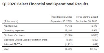 - Confirms forecasted net revenue for fiscal 2020 of between $150 million and $180 million, and positive Adjusted EBITDA for fiscal 2020