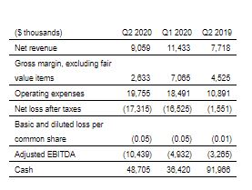 Net revenue increased year-over-year by 17% from $7.7 million in Q2 2019 to $9.1 million in Q2 2020 and decreased quarter-over-quarter by 21% from $11.4 million in Q1 2020. The quarter-over-quarter decrease in net revenue is primarily attributable to the Company’s planned transition from a focus on wholesale to recreational sales. In the quarter, lower wholesale sales were partially offset by the increase in recreational sales. Net revenue was also impacted by actual and anticipated price adjustments of $0.5 million.