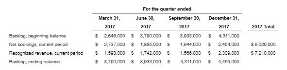 - Our ending backlog as of December 31, 2017 was $4,456,000, an increase of $145,000, or 3%, compared to our September 30, 2017 backlog, and our largest quarter-end backlog in 2017.