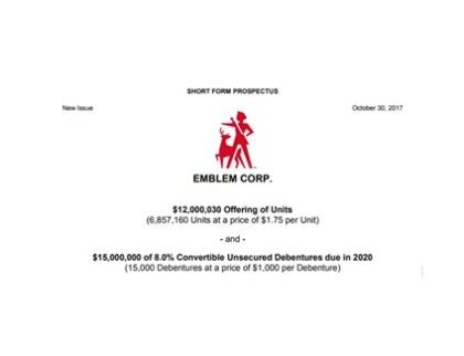 Emblem Announces $25 Million Bought Deal TORONTO, ONTARIO–(Marketwired – Oct. 16, 2017) – Emblem Corp. (TSXV: EMC) (TSXV: EMC.WT) (OTC: EMMBF) (“Emblem” or the “Company”) is pleased to announce...