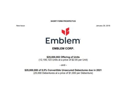 Emblem Announces $50 Million Bought Deal TORONTO, ONTARIO–(Marketwired – Jan. 12, 2018) – Emblem Corp. (TSX VENTURE: EMC) (TSX VENTURE: EMC.WT) (“Emblem” or the “Company”) is pleased to announce that...