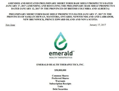 Emerald Health Announces $15 Million Prospectus Sale; Concurrent Secondary Sale VICTORIA, British Columbia, Jan. 03, 2018 (GLOBE NEWSWIRE) — Emerald Health Therapeutics, Inc. (TSXV: EMH) (OTCQX: EMHTF) (“Emerald” or the...