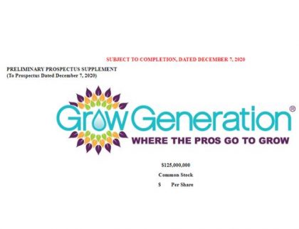 GrowGeneration Announces $125 Million Follow-On Public Offering DENVER, CO December 7, 2020 /PRNewswire/ – GrowGeneration Corp. (NASDAQ:GRWG), (“GrowGen” or the “Company”), today announced that it has publicly filed a...