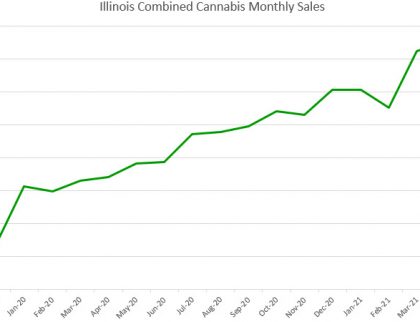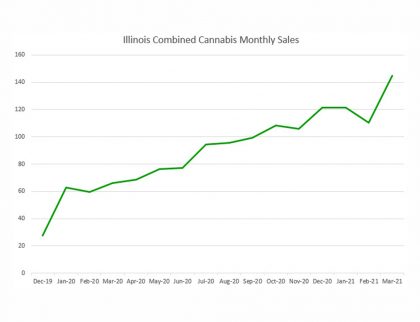 Illinois total cannabis sales reached $144.8 million in March, up 31% from February (3 more days) and up 120% from a year ago : Adult-use sales, according to the...