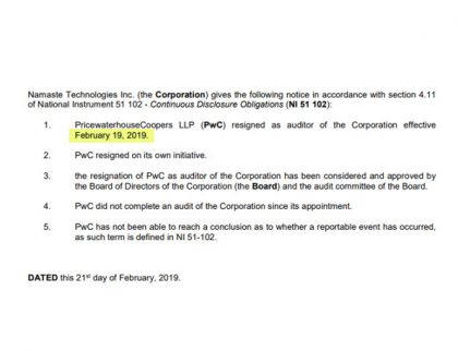 Namaste Technologies Announces Auditor Resignation and Provides Corporate Update TORONTO, March 5, 2019 /CNW/ – Namaste Technologies Inc. (“Namaste” or the “Company”) (TSXV: N) (FRANKFURT: M5BQ) (OTCMKTS: NXTTF) confirmed...