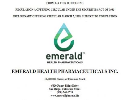 Emerald Health Pharmaceuticals has filed a Tier II Reg A+ preliminary prospectus seeking to raise $50 million by selling up to 10 million shares at $5 per share. The...