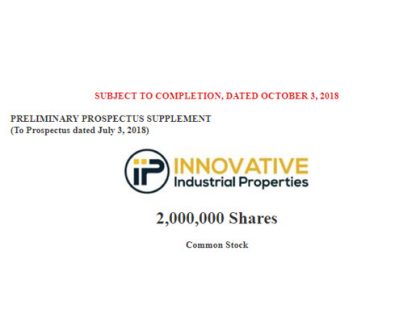 Innovative Industrial Properties Announces Public Offering of 2,000,000 Shares of Common Stock SAN DIEGO, OCTOBER 3, 2018–(BUSINESS WIRE)–Innovative Industrial Properties, Inc. (the “Company”) (NYSE: IIPR) announced today that it...