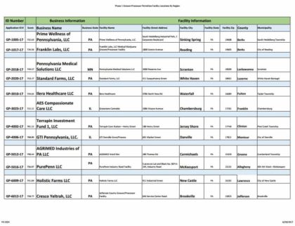 Department of Health Releases 12 Medical Marijuana Permits for Growers/Processors HARRISBURG, Pa., June 20, 2017 /PRNewswire-USNewswire/ — The Pennsylvania Department of Health today released information on the issuance of...