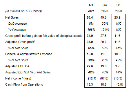 Net Sales increased 106% to $53.4 million in the first quarter of 2021, as compared to $25.9 million in the first quarter of 2020. This strong year over year growth was driven by cultivation capacity expansions in Pennsylvania, New Jersey, and California as well as five new dispensary openings during 2020. Net Sales increased 8% quarter-over-quarter driven by a full quarter of capacity expansion in Pennsylvania and the initial ramp up of the operations in New Jersey.