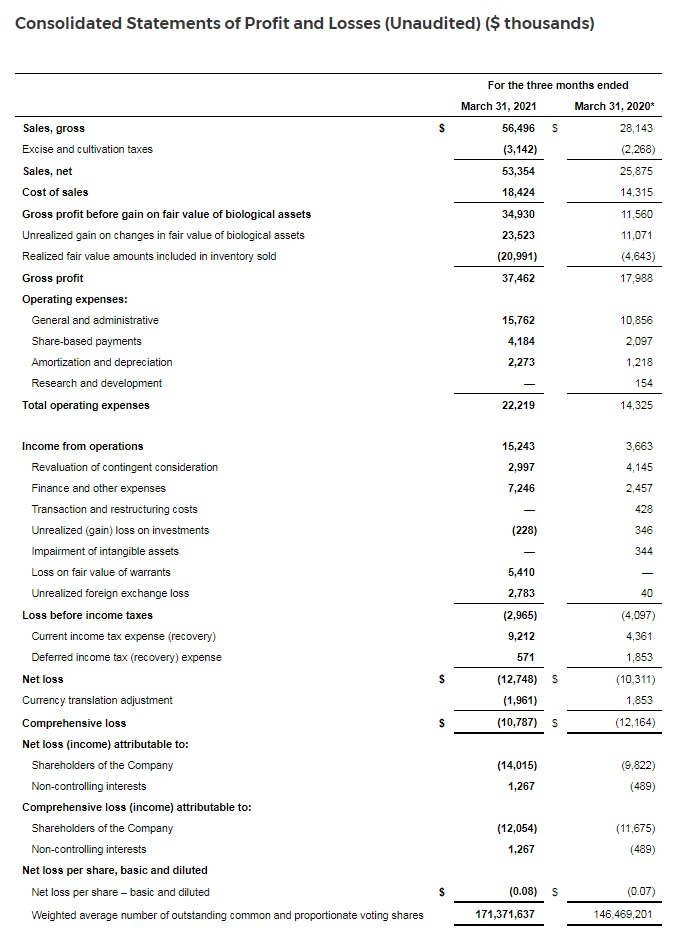 Net loss for the first quarter of 2021 was $12.7 million, largely impacted by a loss on fair value of warrants of $5 million and an unrealized foreign exchange loss of $3 million, along with income tax expense of $10 million, financing, and other expenses of $7 million, share based compensation of $4 million and depreciation and amortization, inclusive of depreciation and amortization in cost of goods sold, of $4 million.