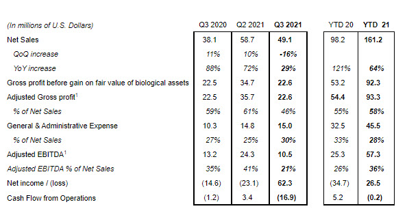 Net Sales increased 29% to $49.1 million in the third quarter of 2021, as compared to $38.1 million in the third quarter of 2020. This year over year growth was driven by the acquisitions of KCR and HMS, cultivation capacity expansions in Pennsylvania, New Jersey, and California as well as an increase in the number of dispensaries from seven to thirteen. Net Sales declined 16% quarter over quarter primarily driven by temporary yield declines in Pennsylvania related to ongoing construction and expansion efforts.
